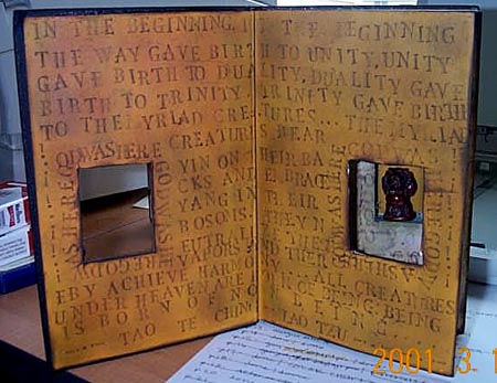 On this inside cover, I took some koans from various Buddhist texts and stamped them in rather crudely one letter at a time to give it a rough kind of visual interest. |